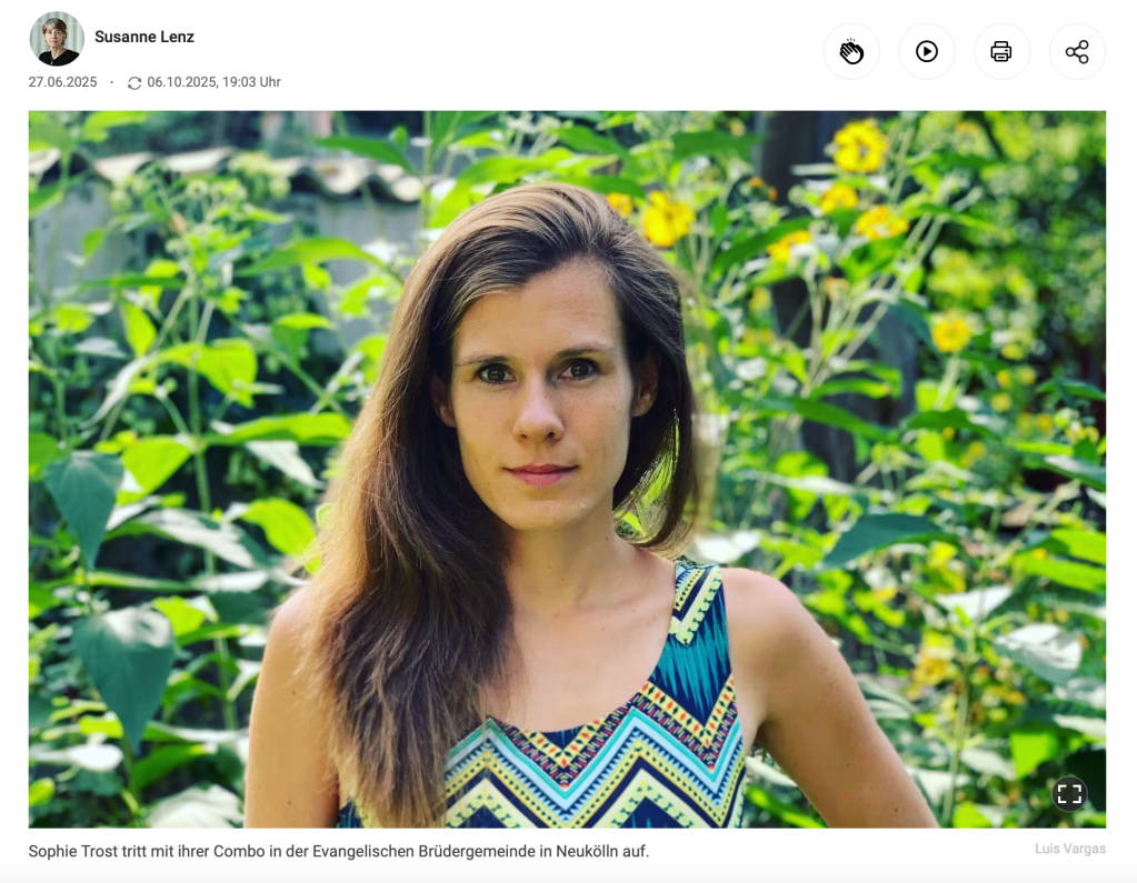 „Sophie Trost […] macht tanzbare Songs, die leicht klingen, aber durchaus ernste Themen haben und sie hat wirklich ein Gespür für Wörter […] Sie ist musikalisch mit ihrer Combo unglaublich gut eingetuned auf die verschiedensten Grooves: Jazz, Bossa, Reggae, Pop und sie selbst ist ja auch unglaublich musikalisch, Sophie Trost schreibt ja nicht nur die Songs und singt sie, sondern sie spielt auch noch Klarinette und Gitarre.“ – Susanne Papawassiliu, radio3 – kulturradio vom rbb